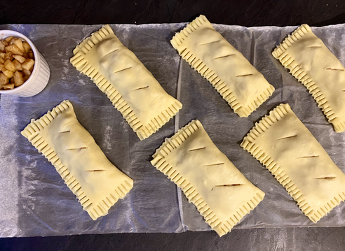 4. Roll out the pastry on the parchment and cut into 6 rectangles. Add about 2 tablespoons of apple filling into each rectangle and fold over leaving an edge which you crimp with a fork. Take a knife and make 2-3 slits on top of each turnover.