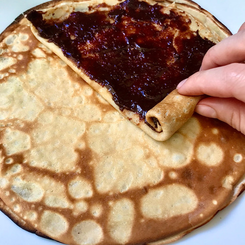 You will make 6-8 crepes, depending on the size. Once they are all done you can enjoy them with some chocolate spread, bananas and strawberries.